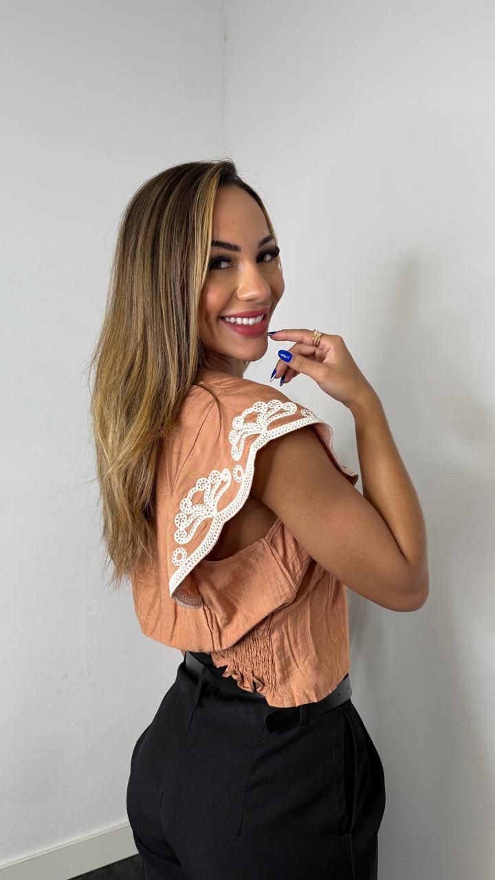 Blusa feminina de modelagem solta e leve, com um toque delicado de elegância. A peça conta com um lindo detalhe de renda nas mangas, que traz um charme especial e um toque romântico ao visual. O decote em V proporciona um caimento suave, enquanto o tecido com leve textura garante conforto e frescor durante o uso. Ideal para combinar com calças de alfaiataria, saias ou até mesmo jeans, criando looks versáteis para o dia a dia ou ocasiões mais especiais.