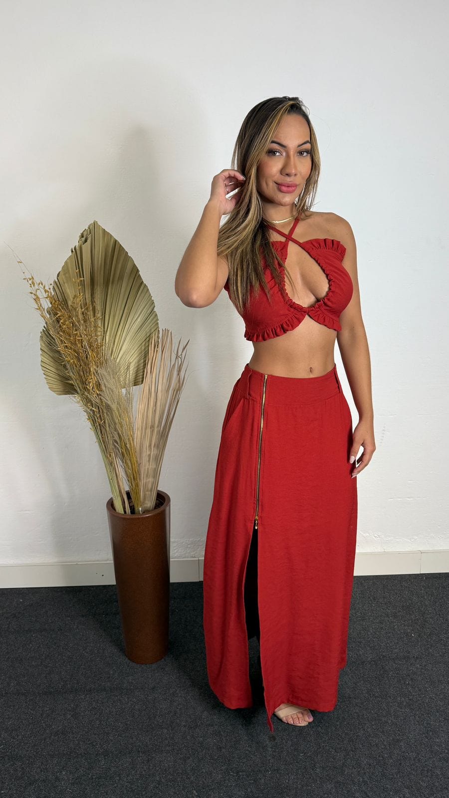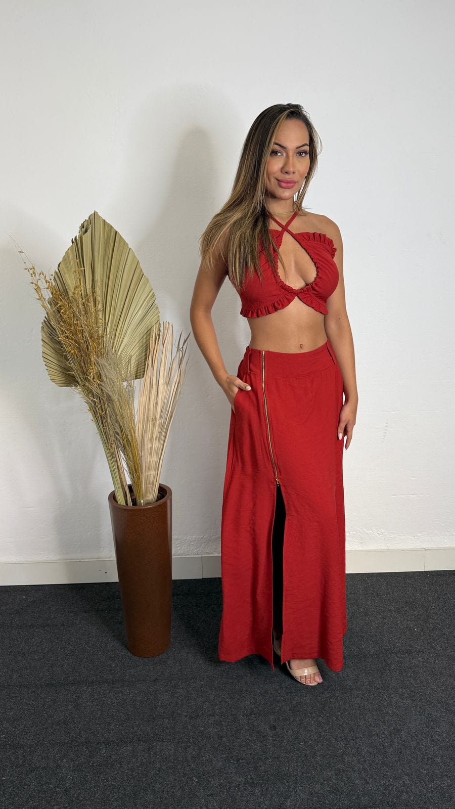 Conjunto feminino composto por top cropped com alças cruzadas no decote, detalhe franzido e acabamento em babados, proporcionando um visual moderno e delicado. A saia longa possui cintura alta, modelagem reta e fenda frontal com fechamento em zíper aparente, que adiciona um toque de sensualidade e sofisticação. Ideal para ocasiões especiais ou para compor looks estilosos e elegantes nos dias mais quentes.