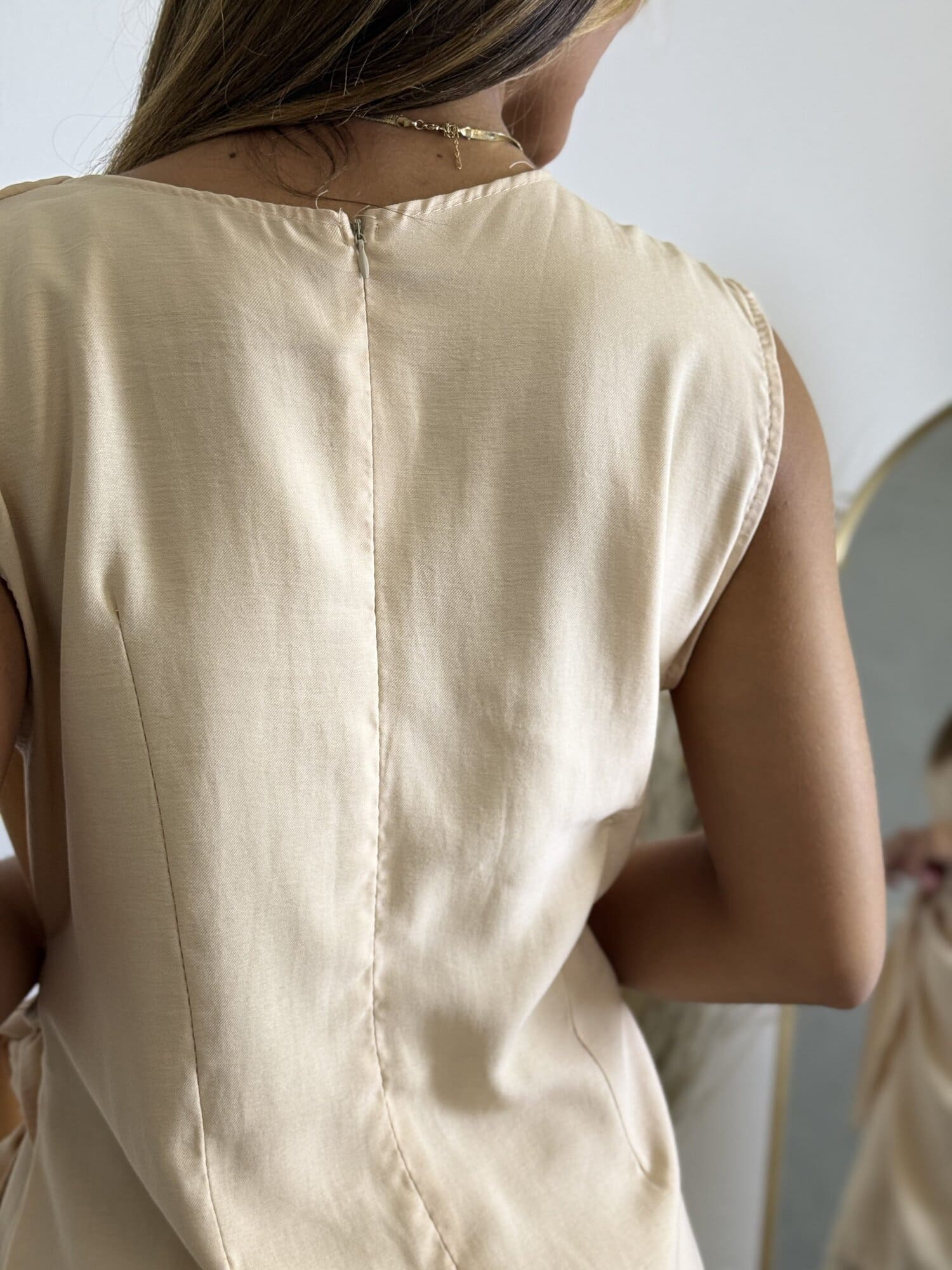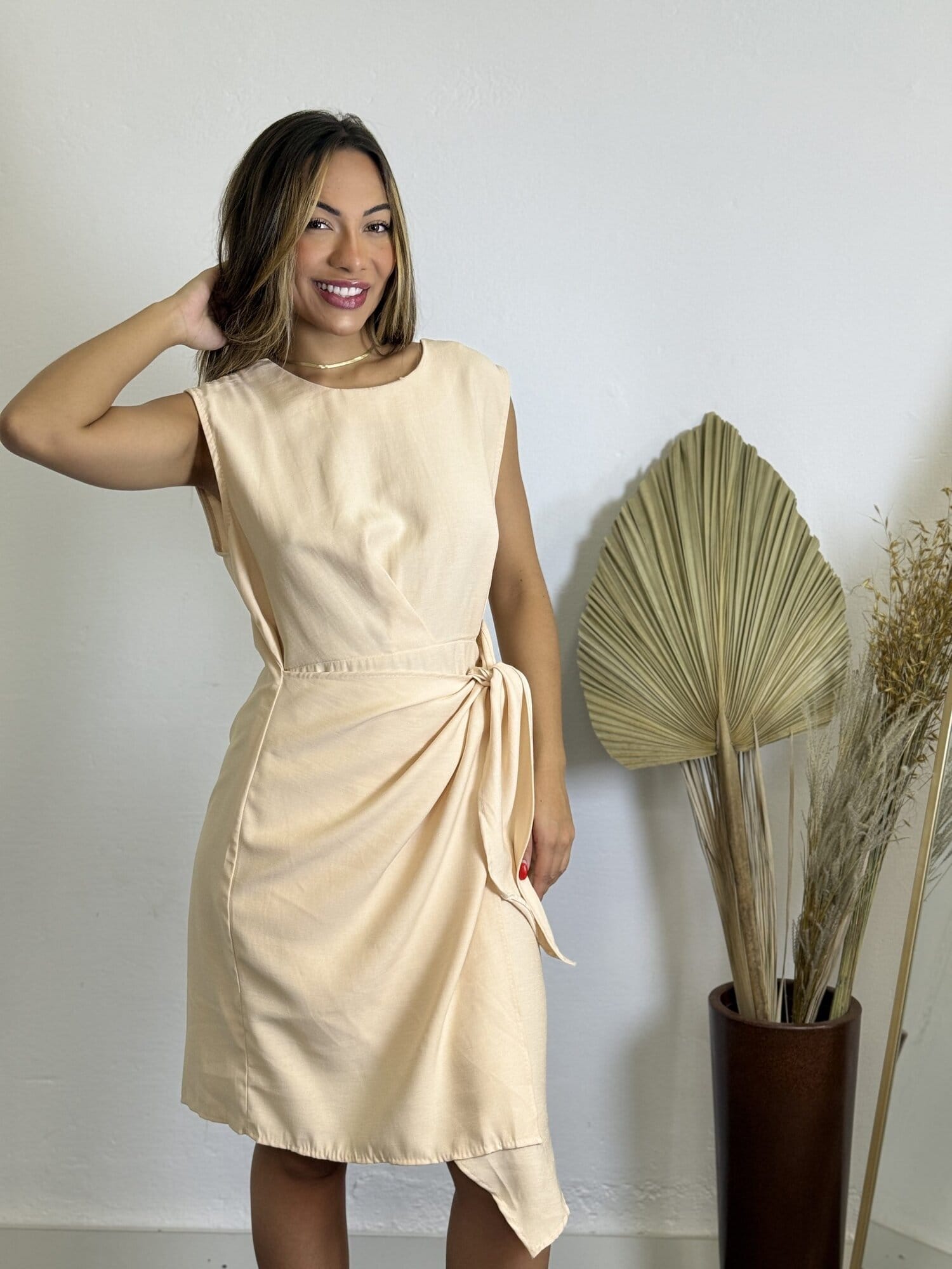 Vestido com modelagem elegante e contemporânea, confeccionado em tecido leve de toque suave. Possui decote redondo, ombros levemente estruturados e amarração lateral que valoriza a silhueta, criando um caimento fluido e feminino. A barra assimétrica confere um toque moderno e sofisticado à peça, perfeita para compor looks casuais ou mais refinados