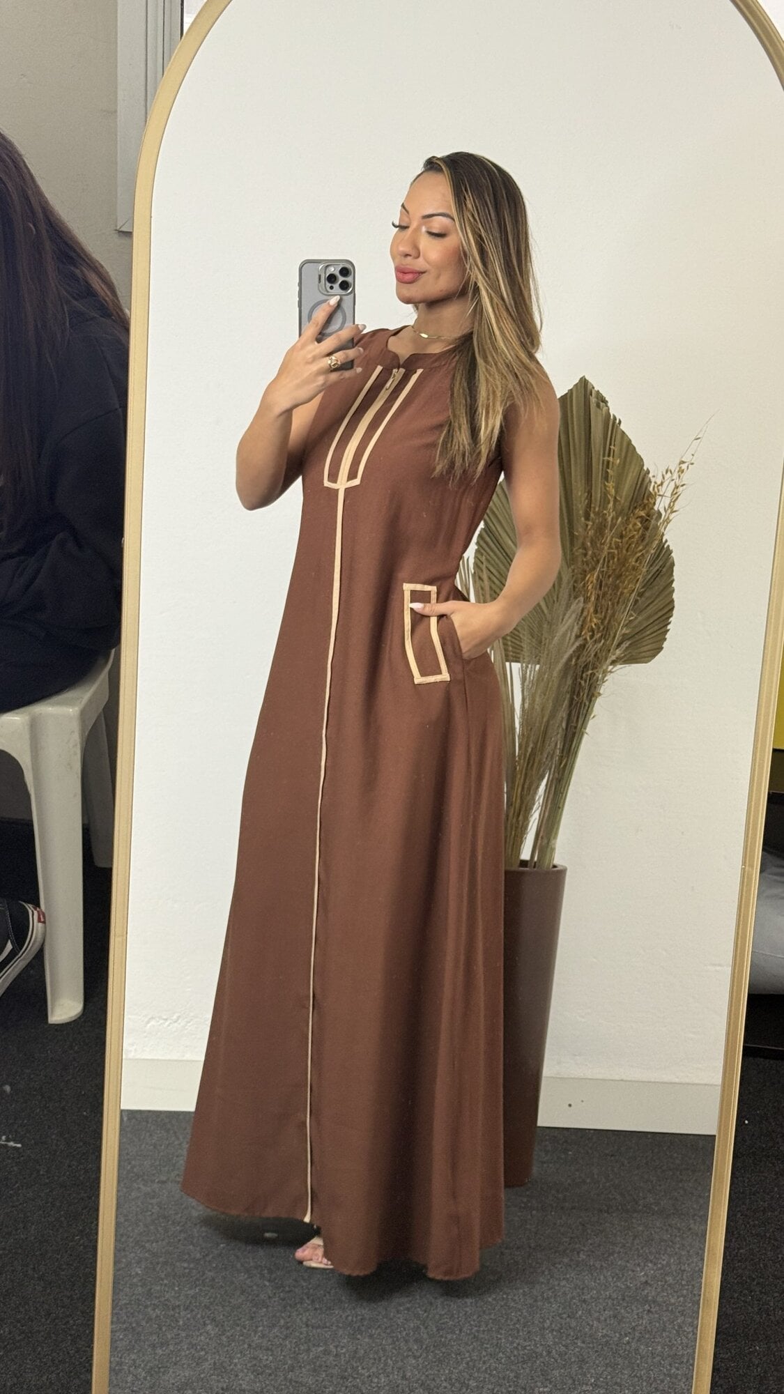Vestido longo sem mangas, confeccionado com detalhes em viés que percorrem a parte frontal e contornam o bolso lateral. Possui modelagem reta e caimento fluido, garantindo conforto e elegância. O design minimalista é valorizado pelos recortes verticais, que alongam a silhueta, e pelo detalhe geométrico no busto. Ideal para compor looks sofisticados e versáteis para diversas ocasiões.
