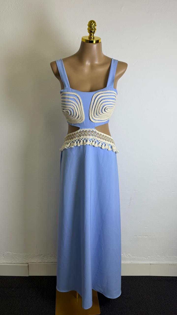 Este vestido longo apresenta recortes na cintura e uma saia fluida.